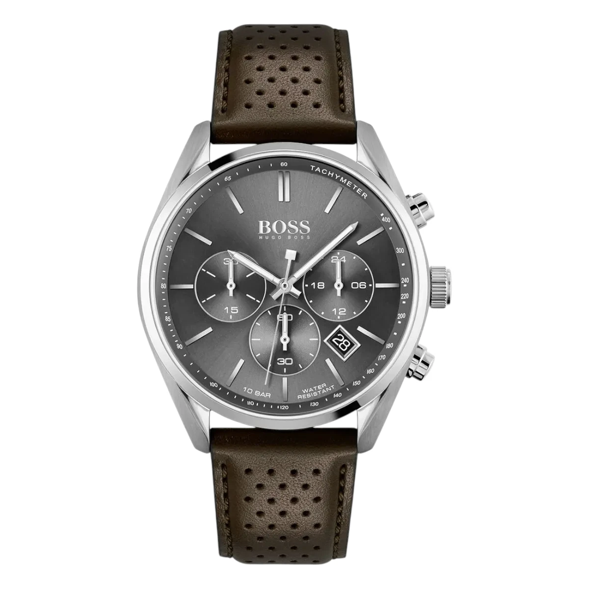Hugo boss klocka Champion med grå urtavla och brunt läderband i en sportigt elegant design. En tydlig herrklocka som passar arbete, vardag och mer uppklädda tillfällen.