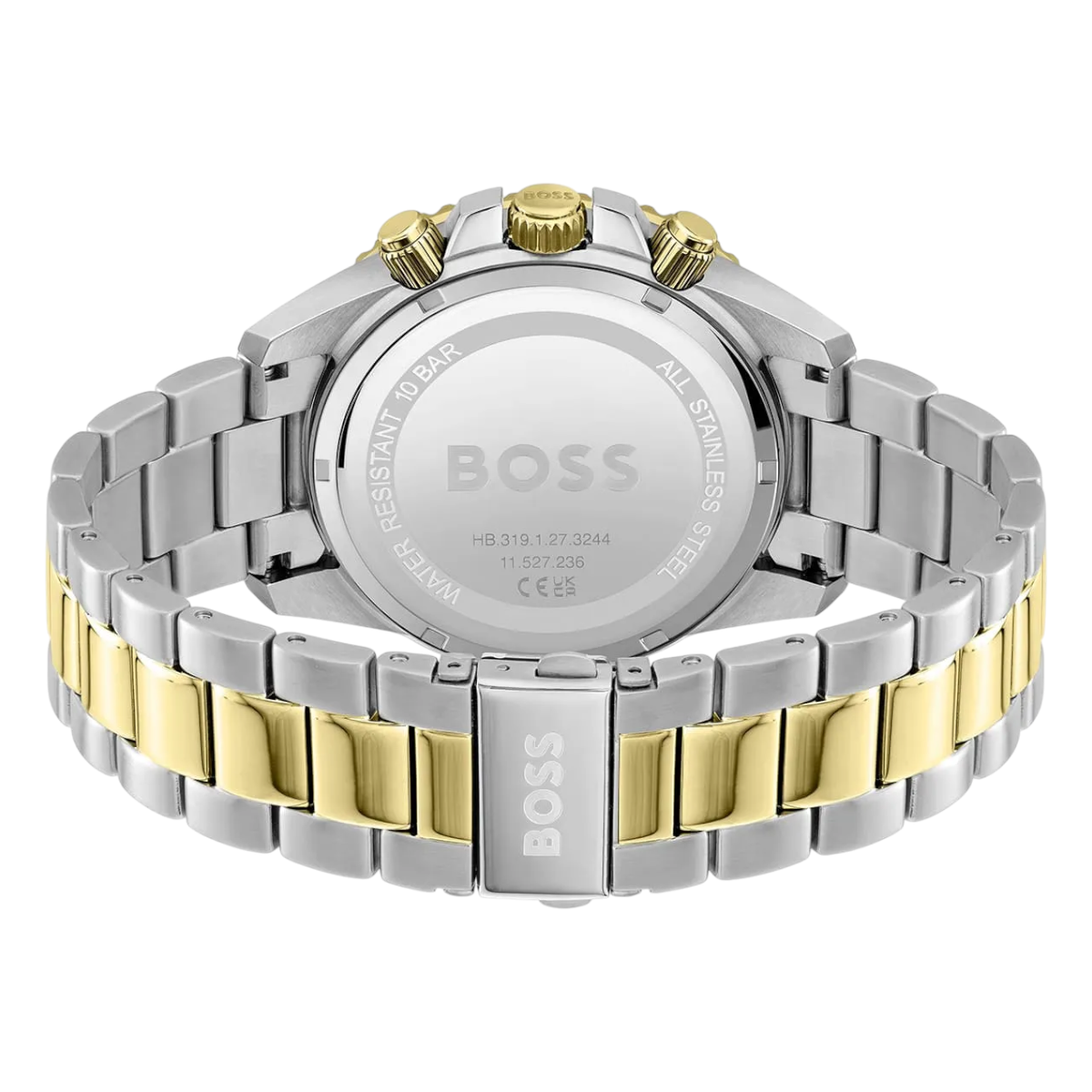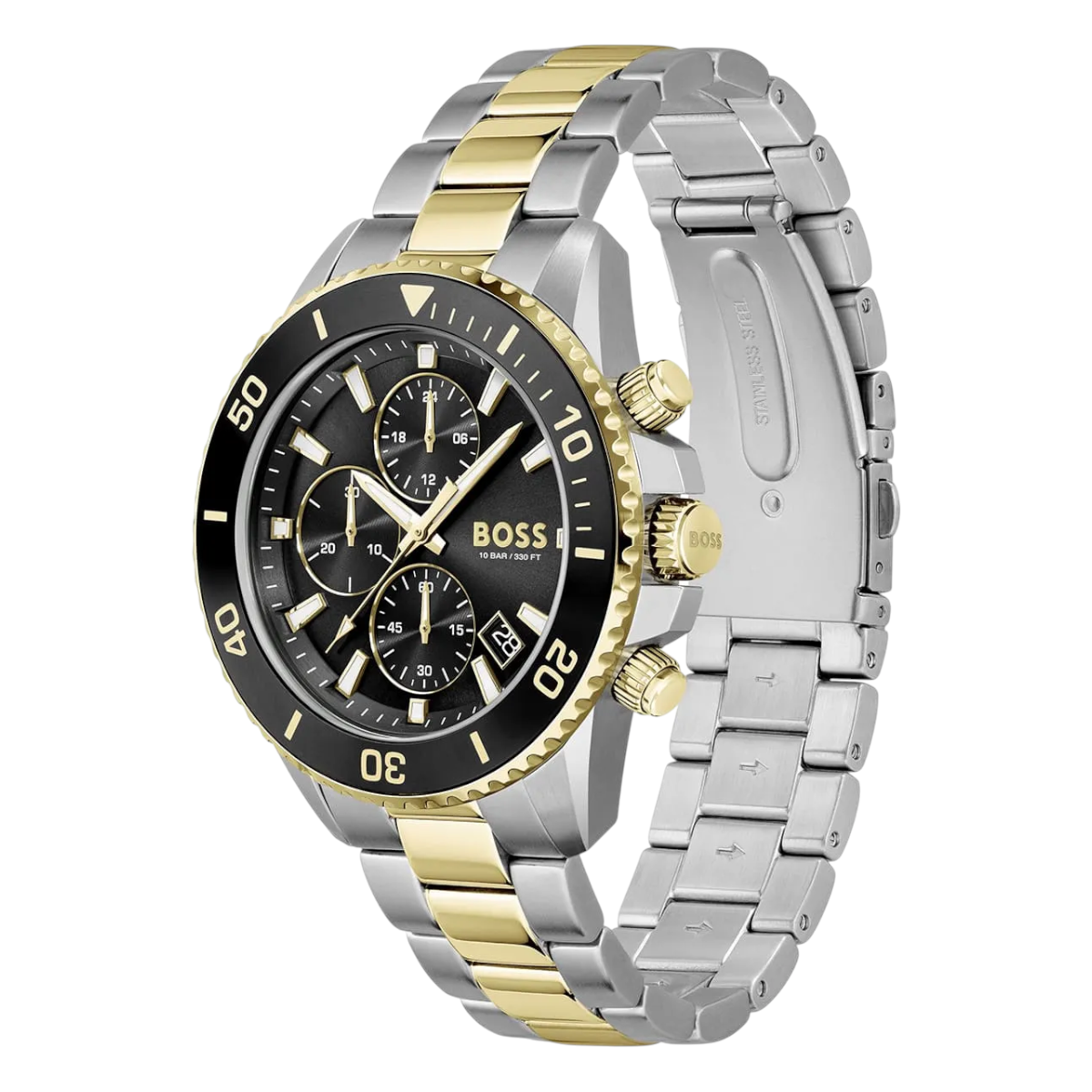 Den svarta tavlan skapar kontrast mot visare, index och kronografregister, medan boett och länk i guldfärgat rostfritt stål ger ett varmare uttryck än klassiskt stål. Som Hugo Boss klocka kombinerar Admiral rena linjer med en färgsättning som känns både modern och mer uppklädd.