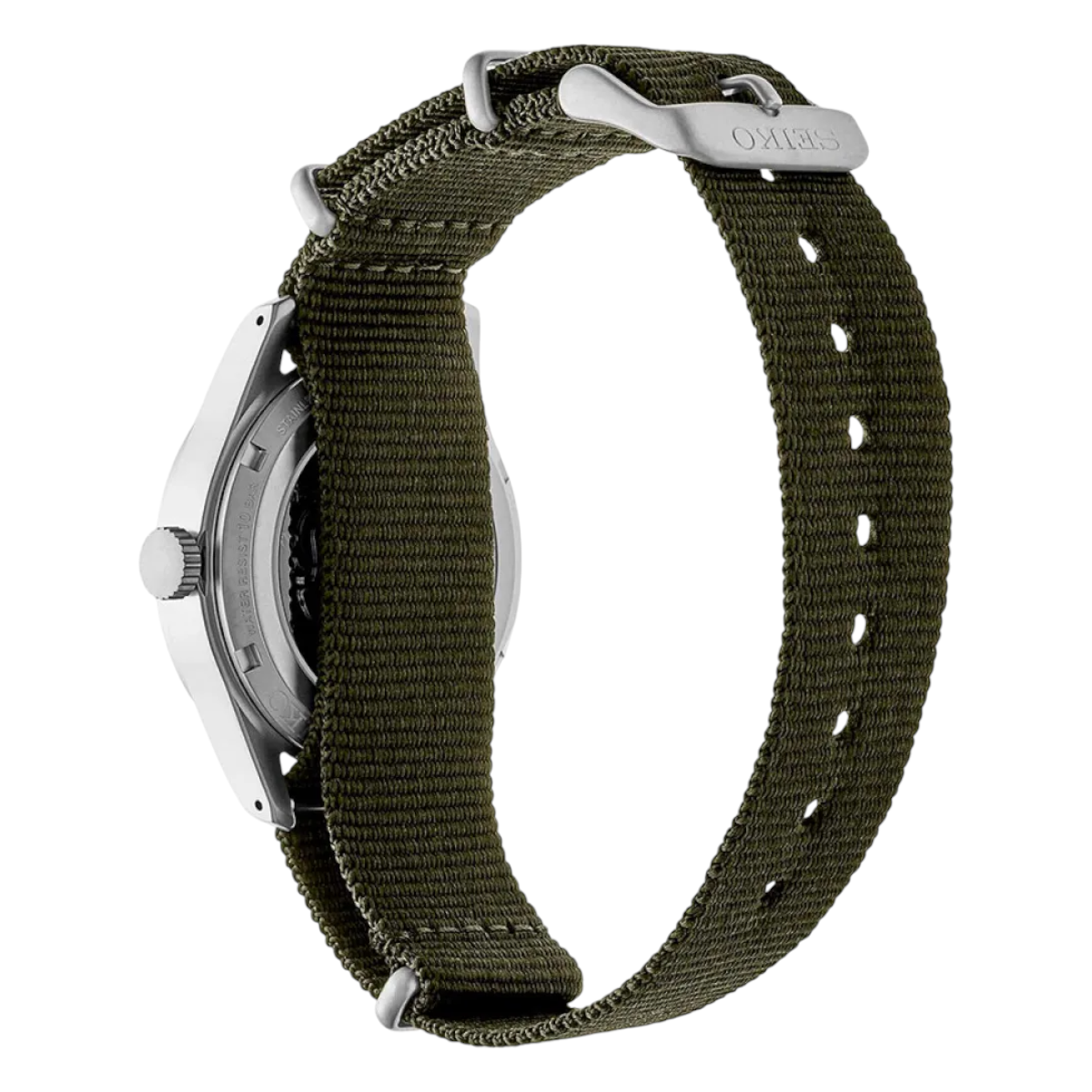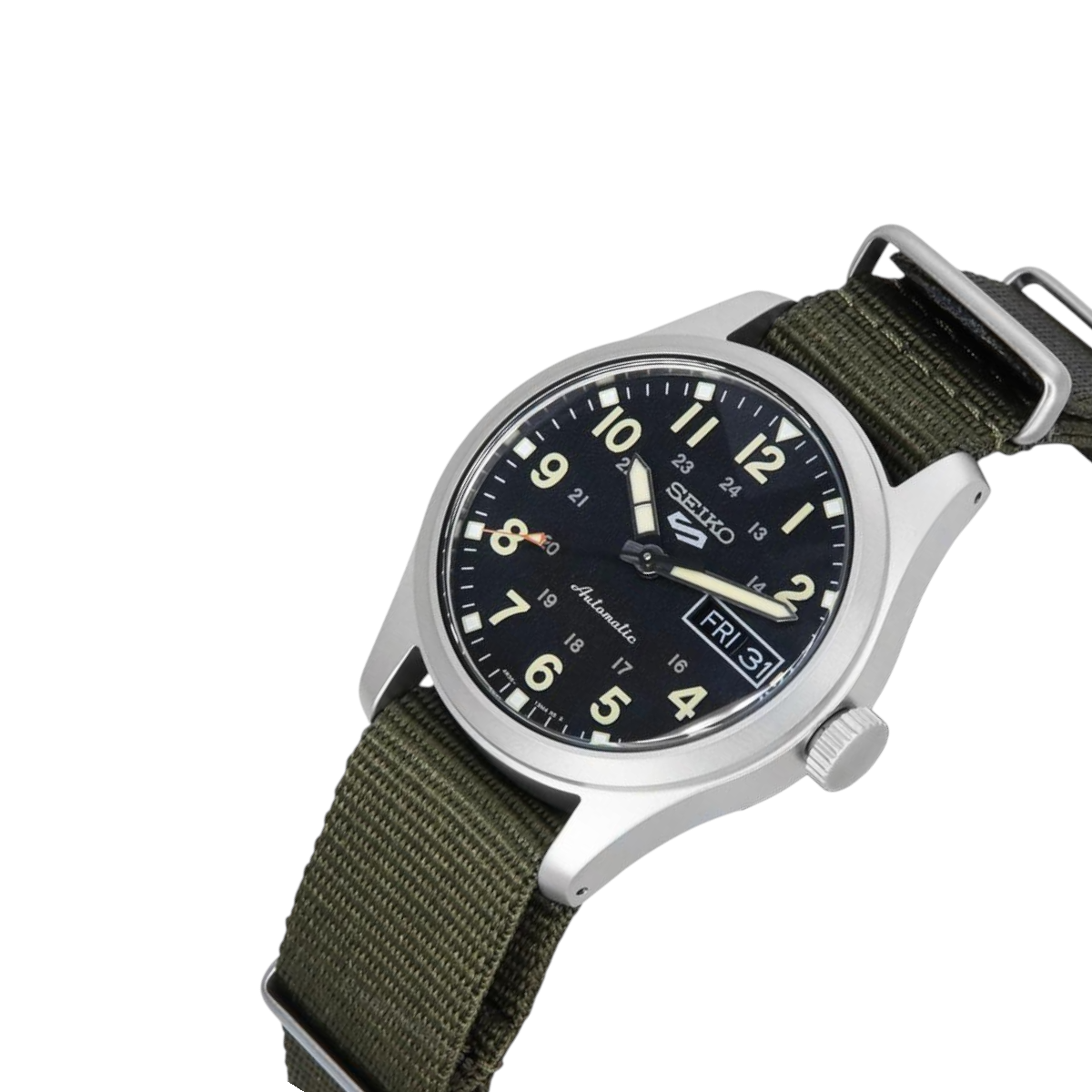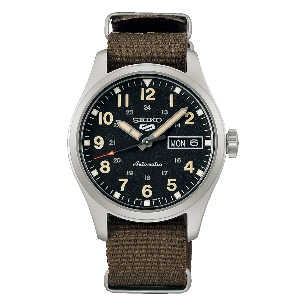Seiko 5 field med svart urtavla, svart textilband och 36 mm boett. Automatisk herrklocka med dag-datum, 24 timmarsvisning och 10 ATM.