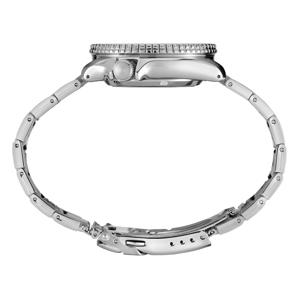 Boetten i 316L kirurgiskt stål mäter 43 mm och ramas in av blå bezel, blå urtavla och stållänk. Hardlex Mineralglas och genomskinligt bakstycke förstärker helheten, medan färgsättningen ger Seiko 5 sports automatic ett tydligt och mer markerat uttryck på handleden.