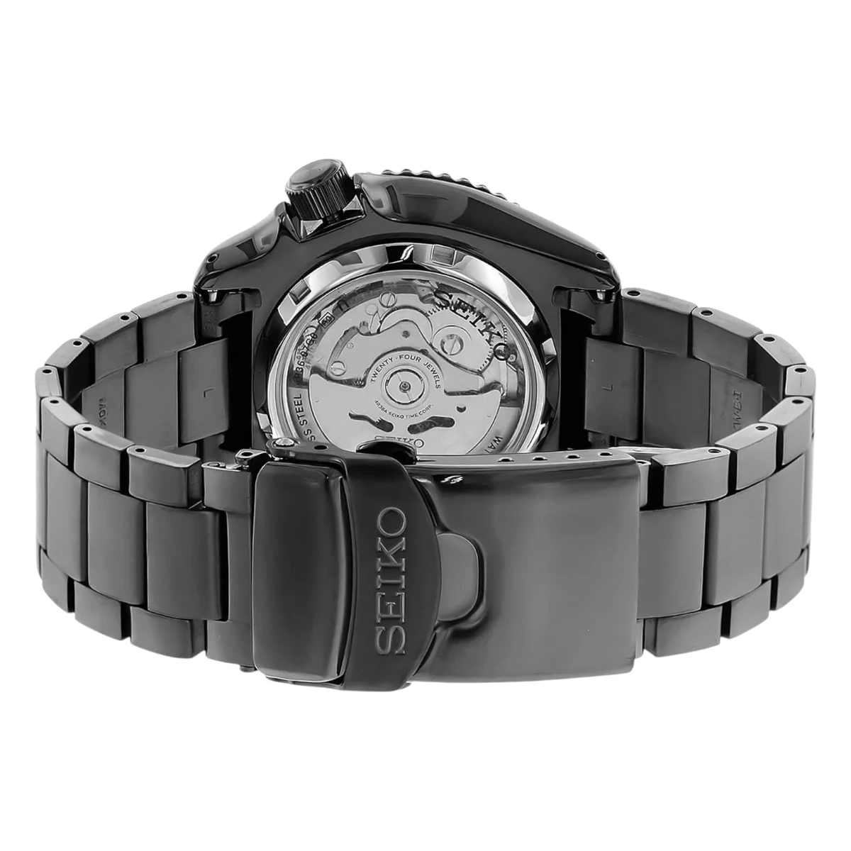 Seiko 5 sports automatic med svart urtavla, svart stållänk och 43 mm boett. Automatisk herrklocka med dag-datum, Hardlex och 10 ATM för vardag.