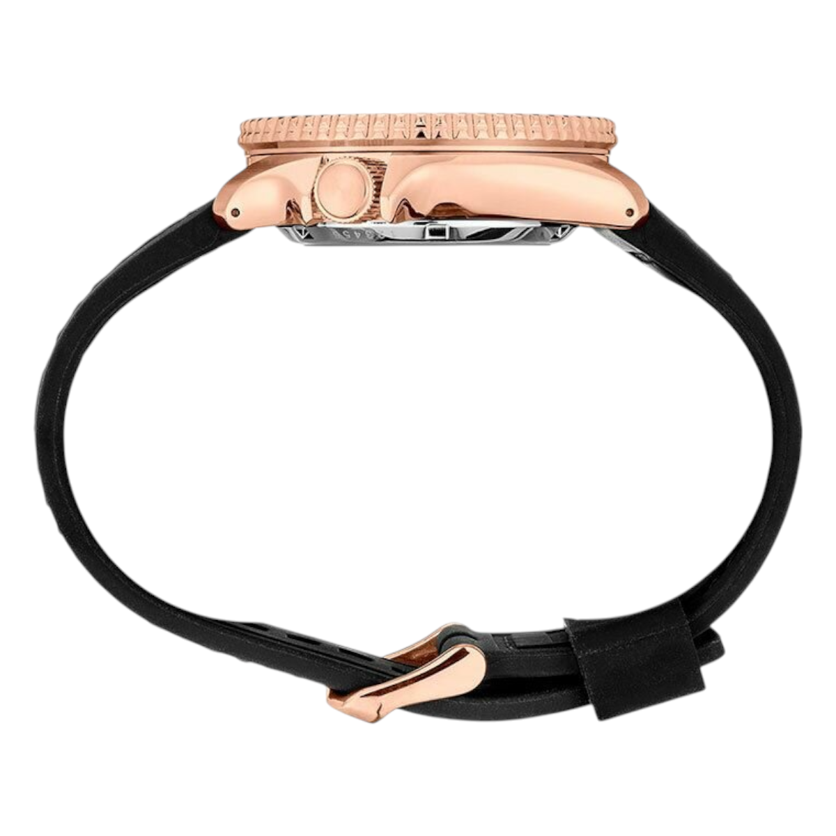 Den runda boetten i rostfritt stål har roséfärgad ton och kombineras med svart urtavla, svart tavelring och svart silikonband. Hardlex och LumiBrite ger Seiko 5 sports ett tydligt uttryck, medan färgkombinationen i svart och rosé ger modellen en mer markerad helhet på handleden.