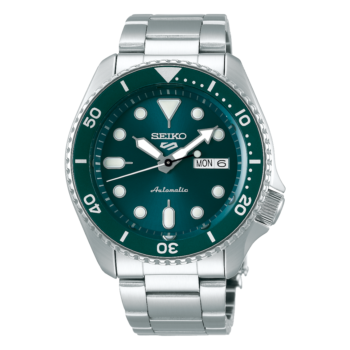 Seiko 5 Sports automatisk herrklocka grön stål är en sportig och pålitlig modell anpassad för daglig användning.