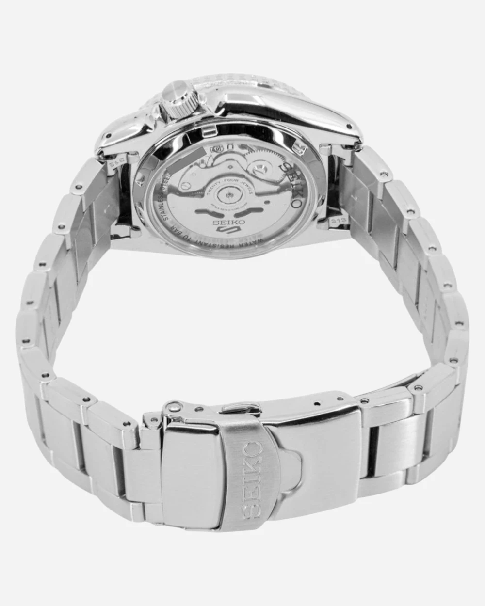 Seiko 5 Sports SRPK29K1 är en mångsidig klocka som passar både herr och dam. Boetten på 38 mm i borstat och polerat rostfritt stål matchas med ett robust stålarmband och viklås för hög komfort. Den svarta urtavlan med självlysande index och visare ger tydlig läsbarhet i alla ljusförhållanden, medan den svarta vridbara bezeln förstärker klockans sportiga uttryck. Klockan drivs av Seikos automatiska kaliber 4R36 med 24 juveler och en gångreserv på upp till 41 timmar. Funktionerna inkluderar veckodag- och datumvisning, svepande sekundvisare samt en skruvkrona för ökad tålighet. Med 10 ATM vattenskydd och mineralglas är modellen byggd för både vardag och fritid. Kombinationen av klassisk Seiko-design, sportig funktionalitet och bekvämt format gör SRPK29K1 till ett utmärkt val för alla som söker en pålitlig klocka i mindre storlek. Levereras med 2 års garanti och originalförpackning från Seiko.