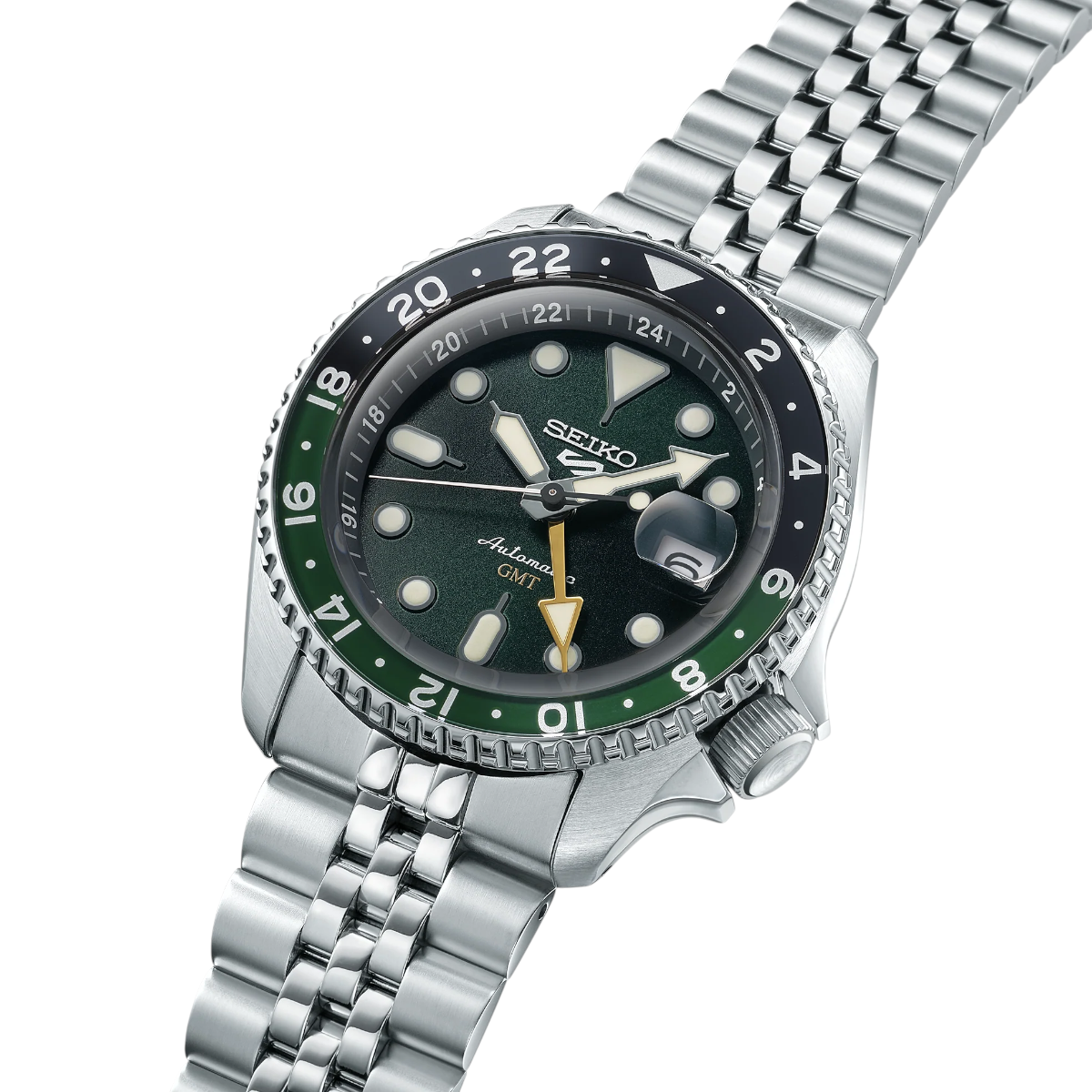 Seiko 5 Sports GMT med grön urtavla, stållänk och 43 mm boett. Automatisk herrklocka med datum, Hardlex och extra tidszon för resa och vardag.