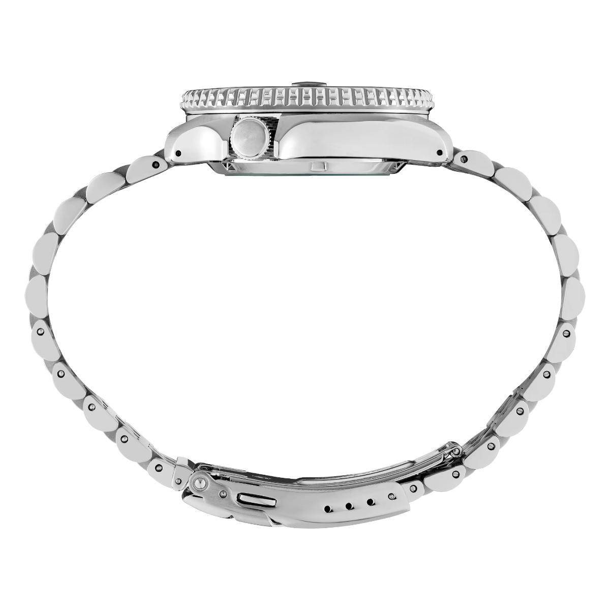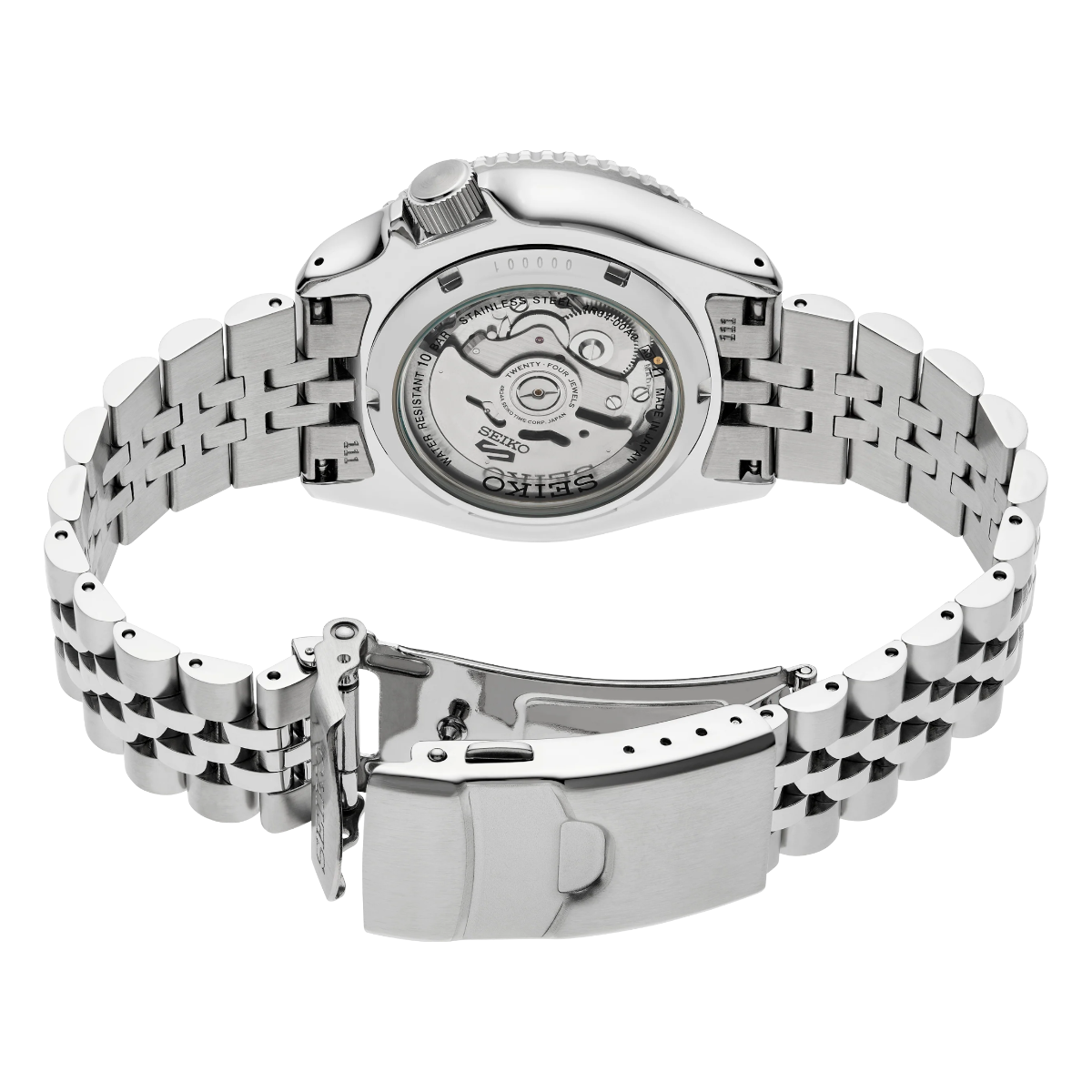 Den 43 mm stora boetten i stål har en balanserad blandning av borstade och polerade ytor och matchas med grön urtavla, bezel i stål och stållänk. Hardlexglas samt självlysande visare och markeringar ger Seiko 5 Sports GMT ett tydligt och funktionellt uttryck.