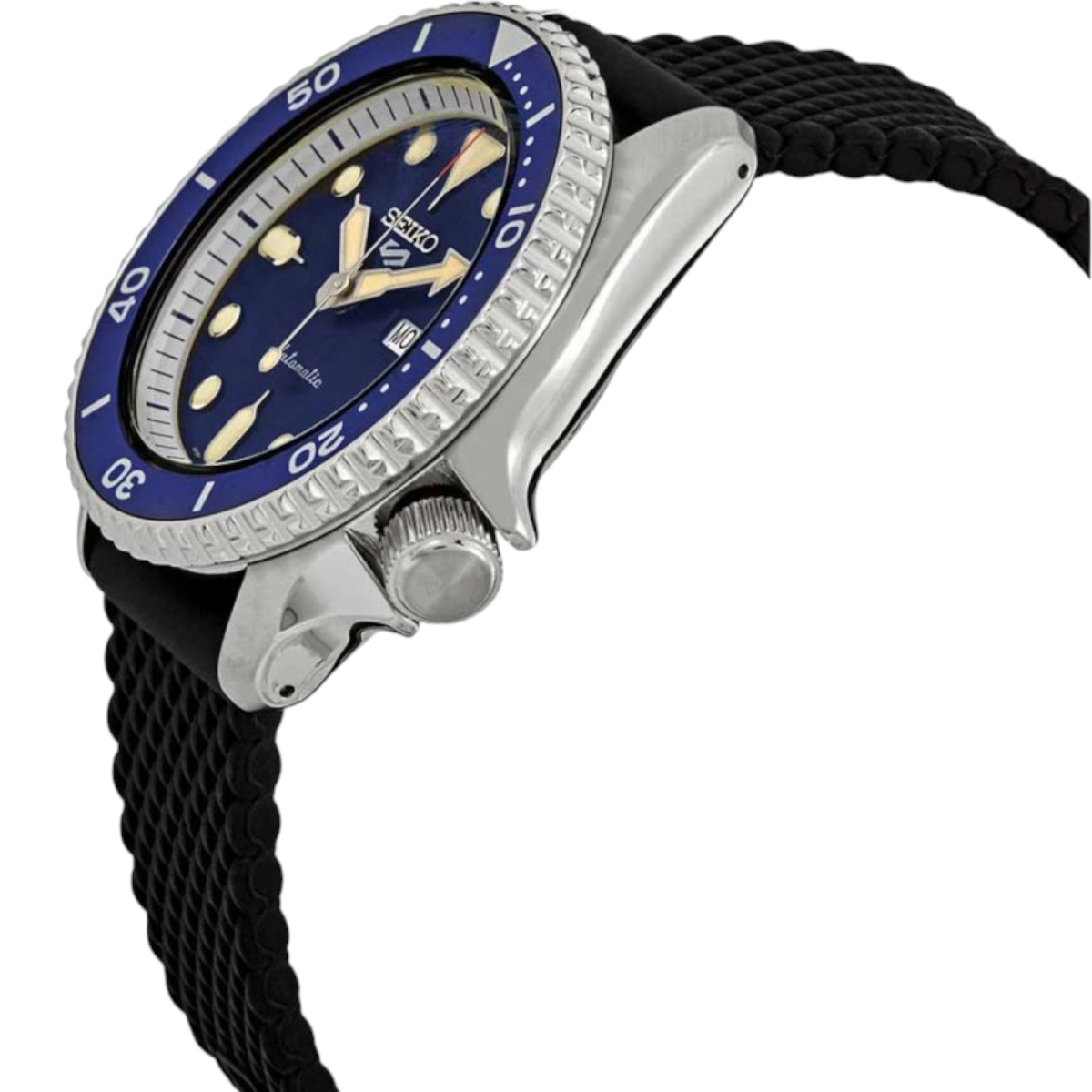 Seiko 5 sports med blå urtavla, svart gummiband och 42,5 mm boett. Automatisk herrklocka med dag-datum, Hardlex och 10 ATM för vardag.