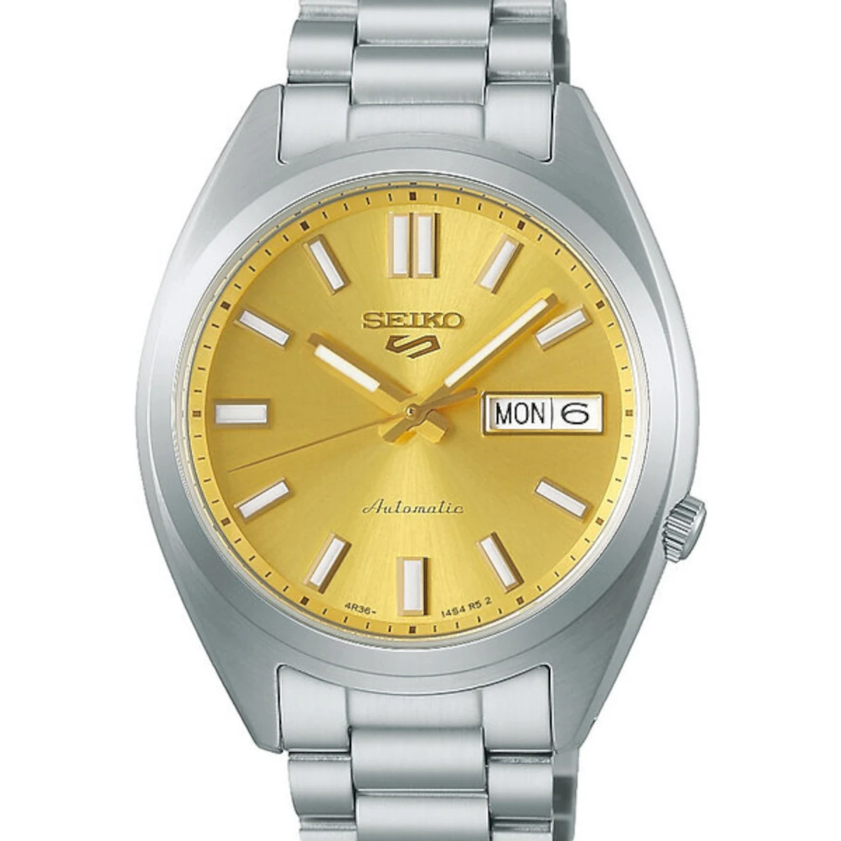 Boetten i stål har borstad och polerad yta och kombineras med guldfärgad urtavla, stållänk och en ren, ej vridbar bezel. Safirglas, självlysande visare och markeringar ger Seiko 5 sports en tydlig helhet, medan seiko 5 automatic tillför den mekaniska känsla som passar seriens uttryck.