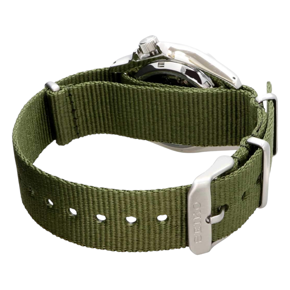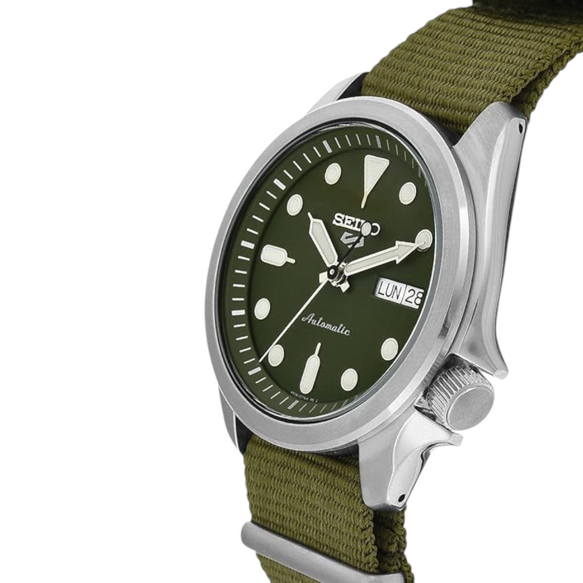 Seiko classic med grön urtavla, grönt textilband och 40 mm boett. Automatisk herrklocka med dag-datum, Hardlex och 10 ATM för vardag.