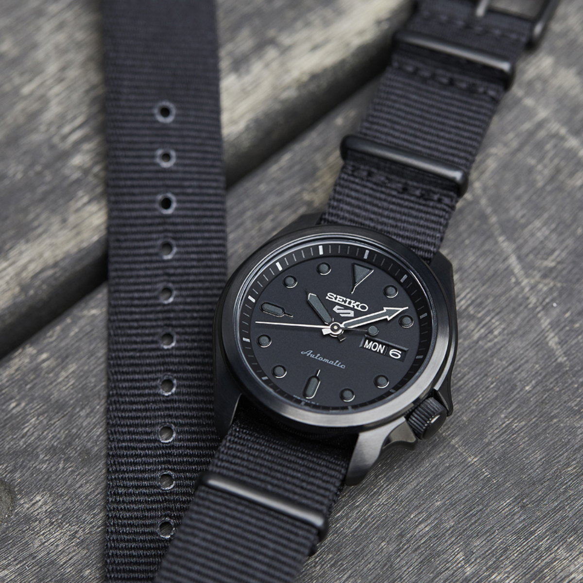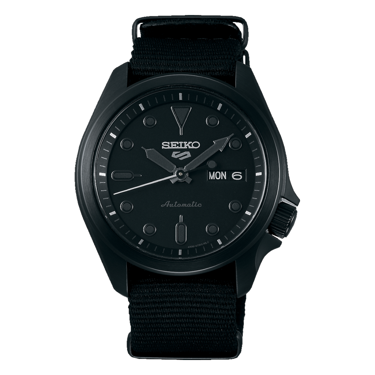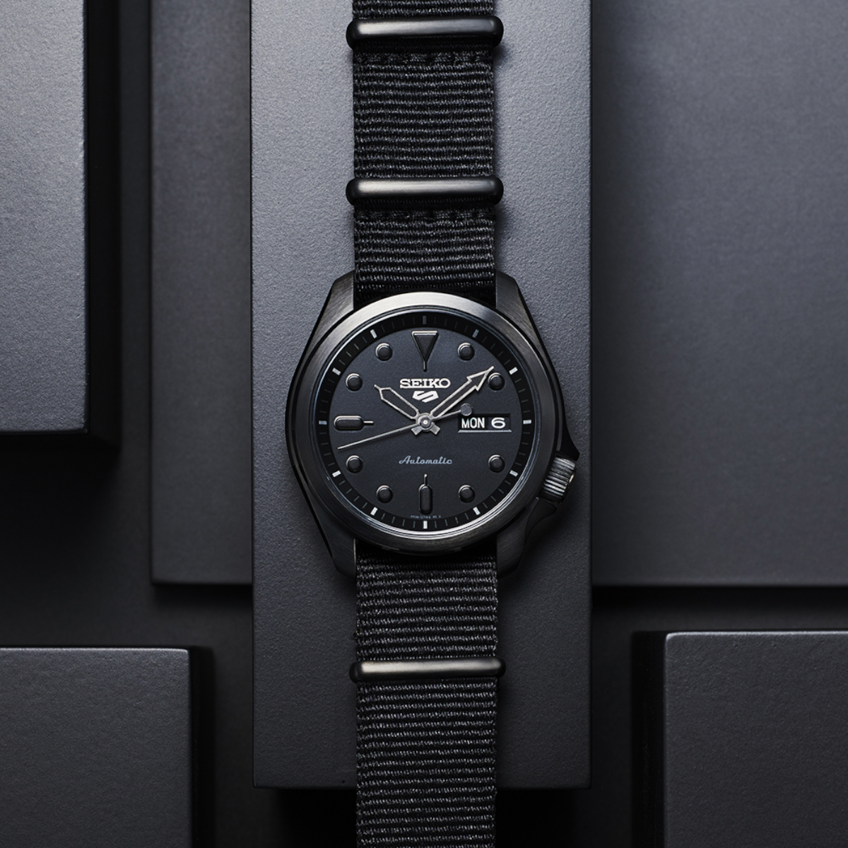 Den runda boetten i stål har svart finish och kombineras med svart urtavla, svart bezel och svart textilband. Hardlex, skruvkrona och den mörka helheten ger Seiko classic ett tydligt uttryck, medan seiko automatic tillför den mekaniska känsla som många söker i en sportigare vardagsmodell.