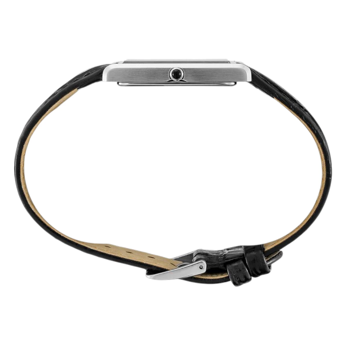 Boetten i rostfritt stål ramas in av vit urtavla, silverfärgad bezel och svart läderband. Den tunna profilen på 7 mm och det tydliga samspelet mellan ljus tavla och mörkt band ger klockan ett avskalat uttryck med klassisk karaktär.