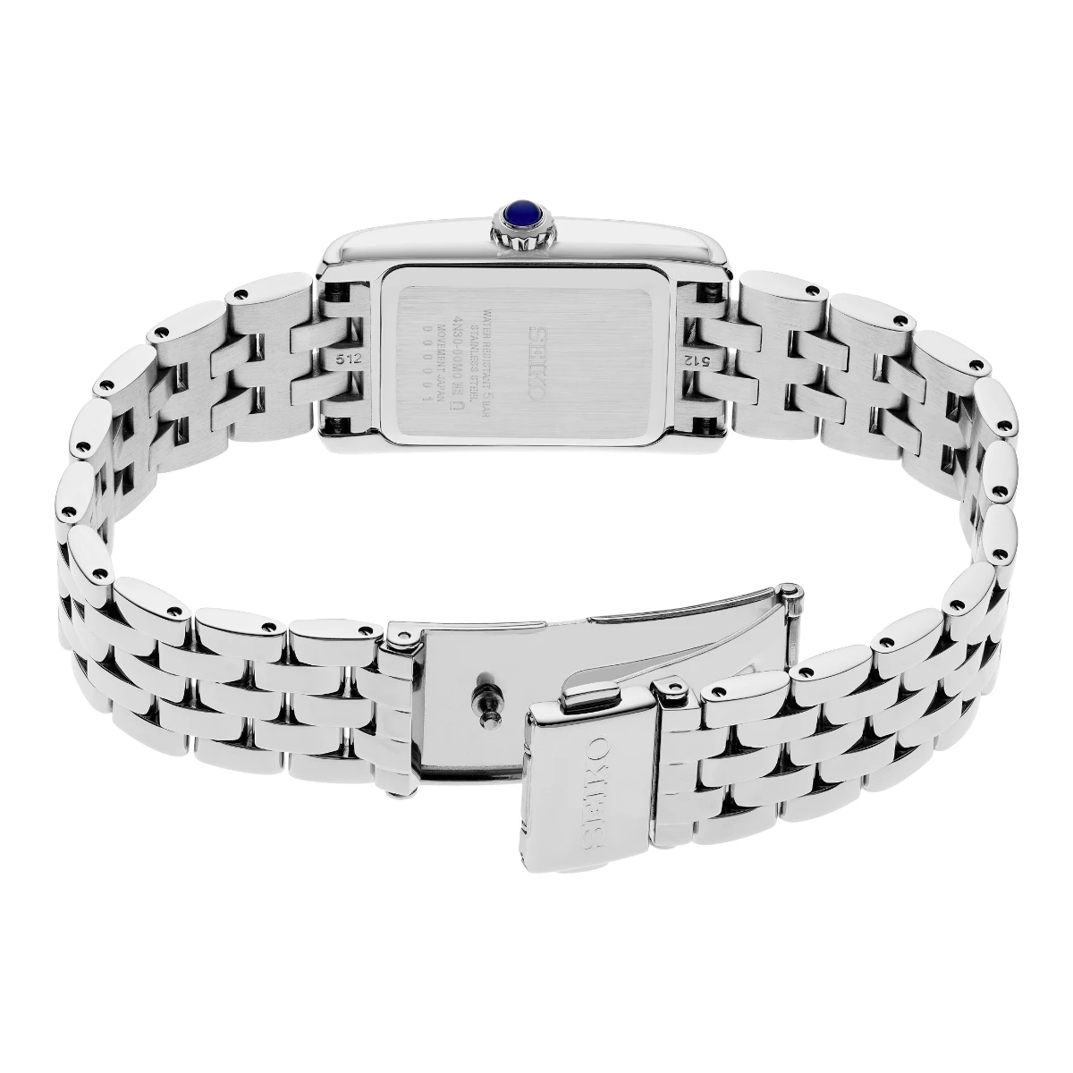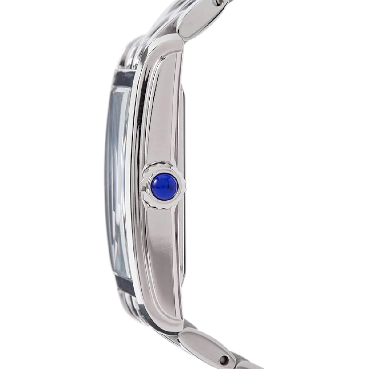 Den blå urtavlan skapar fin kontrast mot boett och länk i stål, vilket ger modellen en tidlös och avskalad karaktär. Den rektangulära formen tillsammans med den rena färgsättningen gör att klockan känns diskret, stilren och lätt att bära till många olika kläder.
