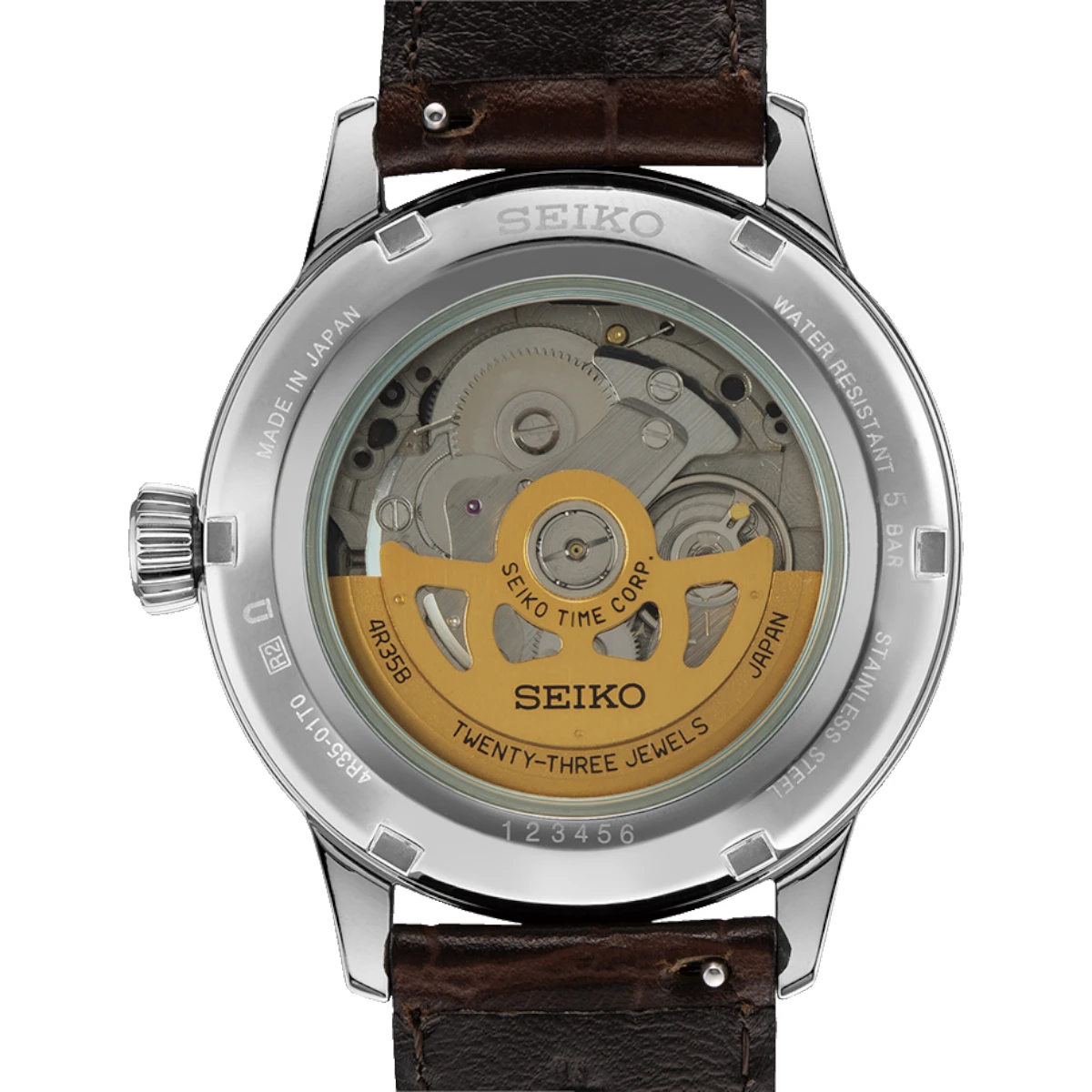 Boetten i rostfritt stål kombineras med blå urtavla, silverfärgad bezel och brunt läderband. Hardlex Mineralglas, genomskinligt bakstycke och luminiscens ger Seiko Presage en balanserad helhet, medan seiko automatic tillför den mekaniska känsla många söker i en klassisk modell.