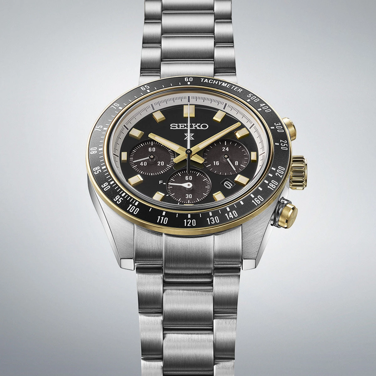 Boetten i rostfritt stål kombineras med svart urtavla, svart bezel och stållänk. Safirglas, LumiBrite och fjärilslås ger Seiko Prospex en tydlig och funktionell helhet, medan seiko speedtimer förstärker modellens sportiga profil och seiko solar bidrar med praktisk drift utan traditionellt batteribyte.