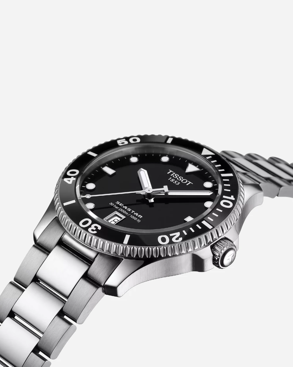 Tissot Seastar 1000 Svart/Stål 40 mm är en schweizisk herrklocka i rostfritt stål med svart urtavla och bezel. Utrustad med ETA F06.412 quartz-verk, datumfunktion, safirglas och 30 ATM vattenskydd är den perfekt för både dykning och vardag.